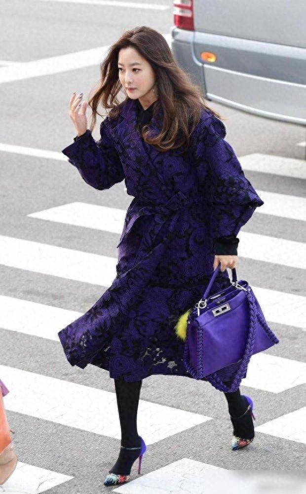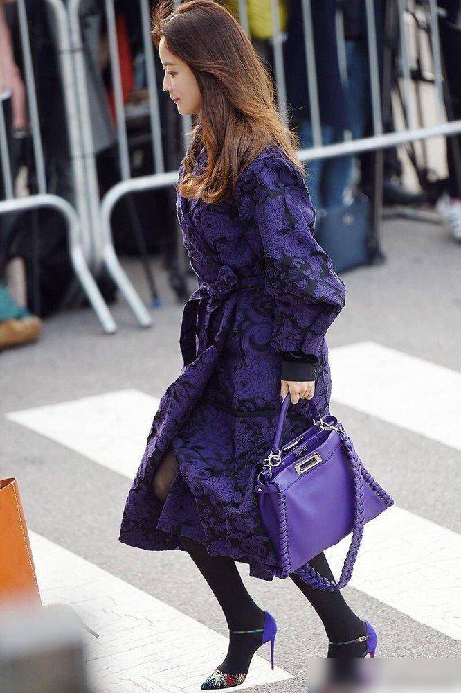 分明是每一步都精准踩在“显好”的点上。大衣的花纹是为了降低紫色的攻击性,腰带是为了显腰,黑丝是为了显腿细,包包是为了统一色调,就连高跟鞋上的紫色小细节都不放过。换成我们普通人,照着这个思路选款:比如选带花纹的紫色大衣,搭配哑光黑丝和同色高跟鞋,背个同色系编织包,是不是也能营造出那种“神秘又高级”的氛围感?